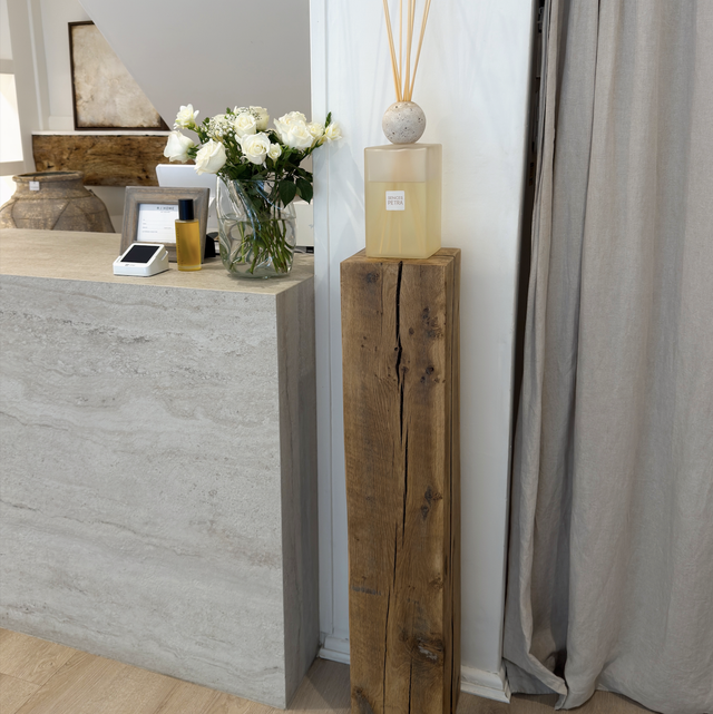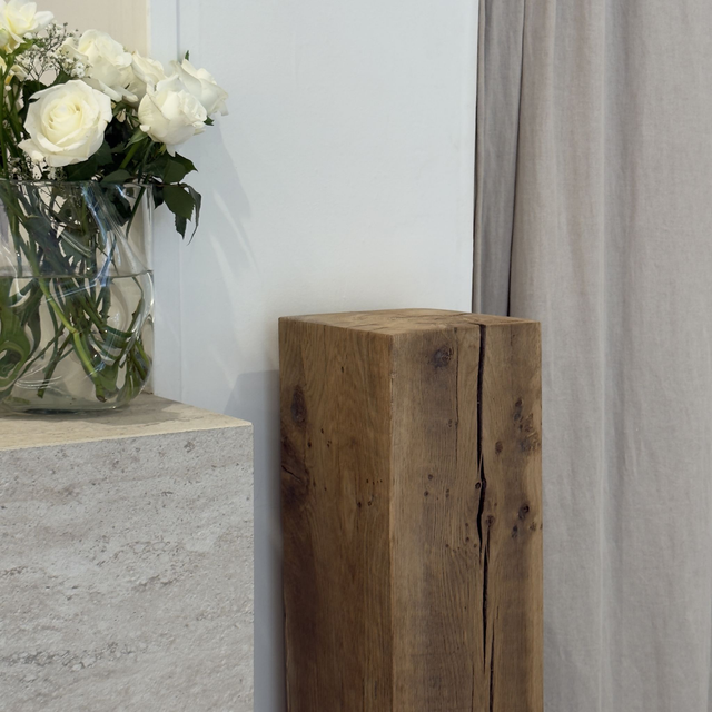 Our plinths are made from 200 year old reclaimed oak, therefore cracks, scuffs, open grain, old nail holes, saw marks and hammer indents are a common characteristic. These quirks give this piece its individuality and charm.
