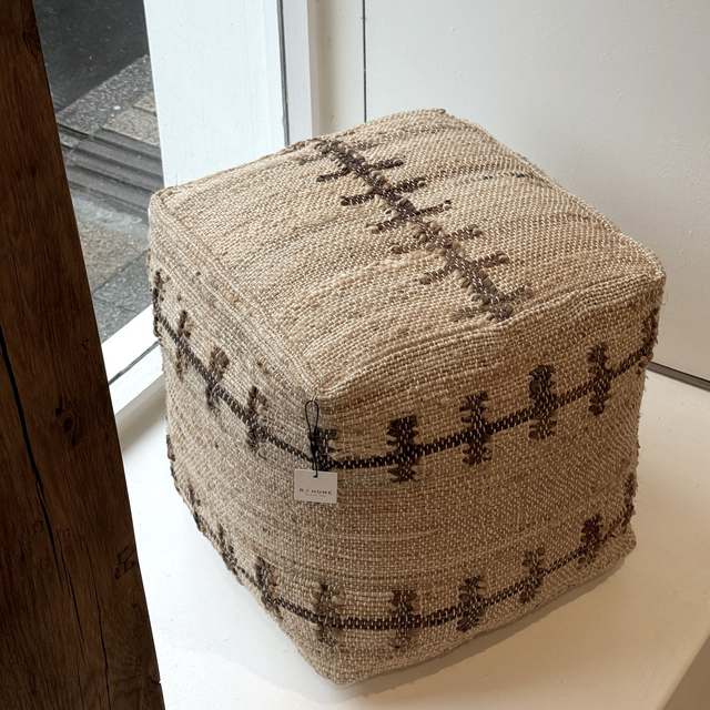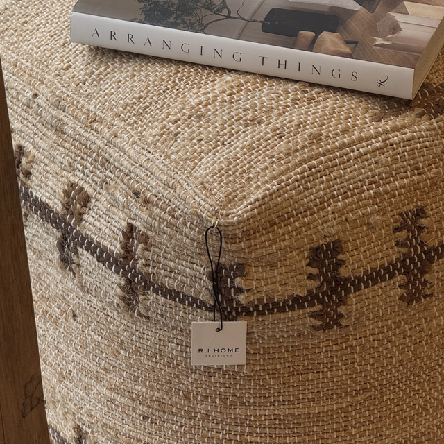 Textured Jute Pouf, made of jute with leather and cotton details, stands out for its rich texture and bohemian aesthetic.