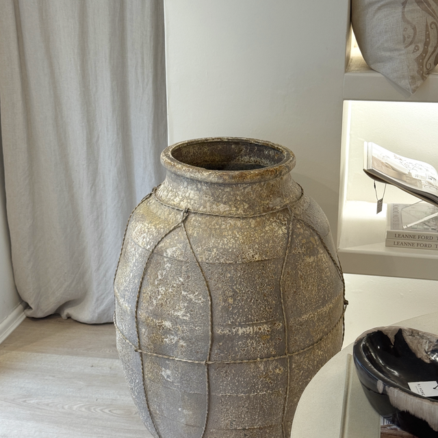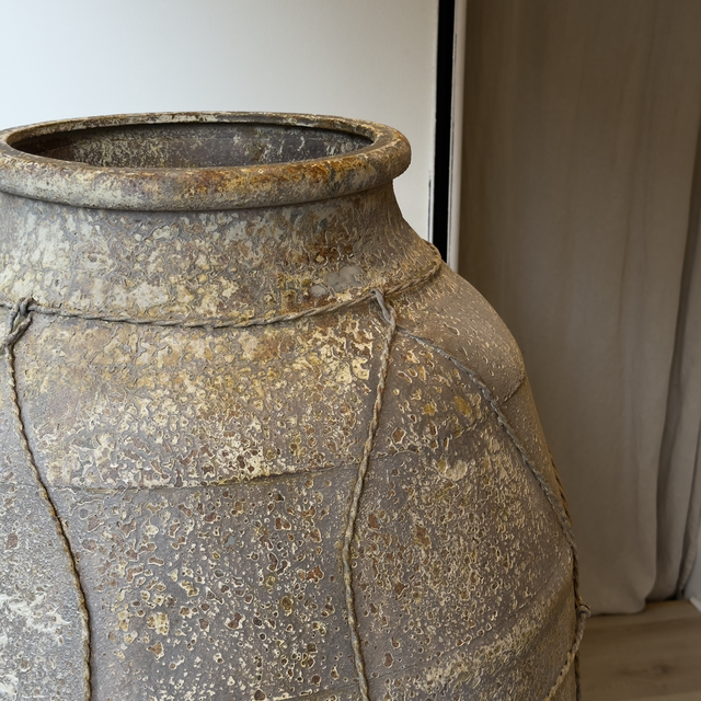 A stunning oversized, rustic vase made from iron, displayed on a stand with rope detailing.